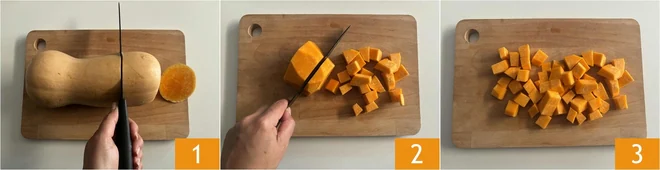 Place the pumpkin cubes in a large baking dish 4, cover with plastic wrap 5, pierce the surface, and cook in the microwave on high power for 6 minutes 6. If you don't have a microwave, you can steam the pumpkin: it will take about 10 to 12 minutes.