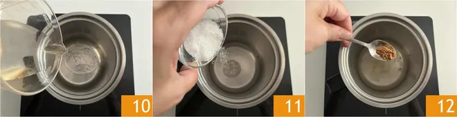 Now proceed with the syrup: in a small saucepan, pour the water 10, sugar 11, and spices 12.