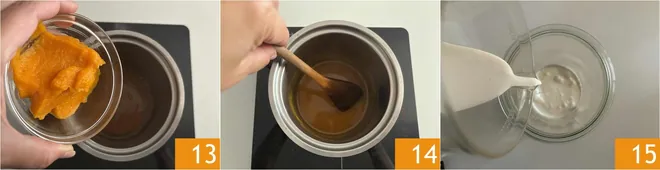 Add the pumpkin cream 13 and bring to a boil, then simmer on low heat for about 2 or 3 minutes, continuing to stir. Set the syrup aside and let it cool 14. Move on to the whipped cream: pour the cold cream into a bowl 15 and add the powdered sugar.