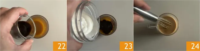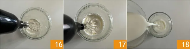Beat with an electric mixer 16 until you achieve a firm and stiff consistency 17. Now focus on the frothed milk: pour the milk into a large glass 18.