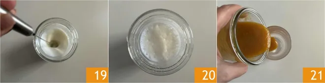 Then take a frother 19 to create the foam 20. Finally, prepare the coffee. You are ready to assemble the cups: pour the pumpkin syrup at the bottom 21.