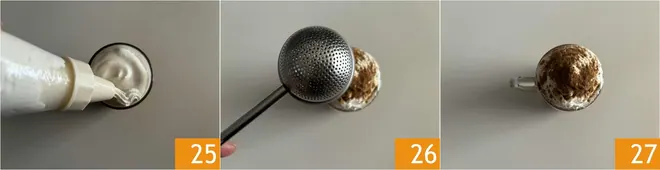 Finish by garnishing with plenty of whipped cream 25 and a sprinkle of cinnamon 26. Your pumpkin spice latte is ready to be enjoyed 27!