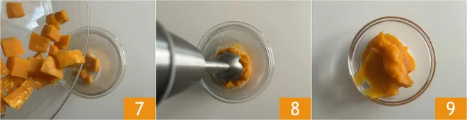Once cooked, transfer the pumpkin to an immersion blender jar 7 and blend 8 to obtain a smooth and homogeneous puree 9. Set aside.