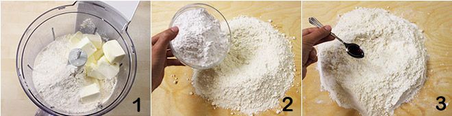 To prepare the pumpkin tart, start with the crust: place the flour, cold refrigerator butter, and a pinch of salt in a food processor, then blend until you get a sandy, floury consistency 1. Now transfer the mixture onto a work surface, forming the classic "fountain," then add the powdered sugar 2 and vanilla extract (the tip of a teaspoon will be enough) 3.