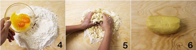 and the yolks 4. Knead with your hands for a few minutes 5 until you get a soft and compact dough 6. Form a ball, wrap it in plastic wrap, and let it rest in the refrigerator for at least half an hour (for more details on how to make shortcrust pastry, Shortcrust pastry).