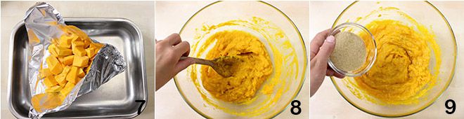 Clean the pumpkin, remove the seeds and skin, then cut it into chunks and cook it in a preheated oven at 392°F, covered with aluminum foil, for 45 minutes, or until it is softened 7. After the necessary time has passed, transfer the pumpkin to a bowl and mash it well with a spoon or fork 8, add the brown sugar 9.