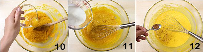 the egg 10 and then the fresh cream 11. Finally, add the cinnamon and nutmeg 12.