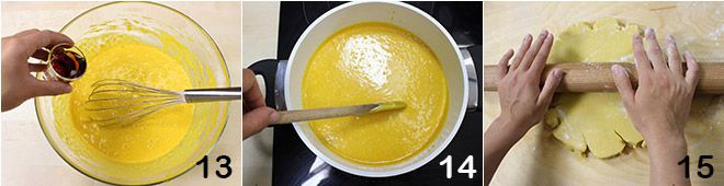 then the Marsala and some freshly grated ginger 13. Mix carefully, then transfer the obtained cream to a saucepan and thicken it over low heat for about 5-10 minutes, stirring frequently 14. Take the shortcrust pastry out of the refrigerator, transfer it to the floured work surface, and roll it out with a rolling pin 15 until you get a layer about 1/5 inch thick.
