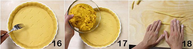 then spread it in a 10-inch buttered and floured mold. Prick the bottom of the crust with the tines of a fork 16 then pour in the pumpkin cream 17. With the remaining shortcrust pastry, prepare strips 18.