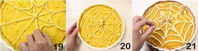 to create a web design 19, then shape two spiders 20: form four balls, two larger for the body and two smaller for the head, and place them on the web. Bake the tart in a preheated hot oven at 392°F for the first 20 minutes, and then at 356°F for another 30 minutes; if the tart browns too much, cover the mold with aluminum foil and finish baking. After the necessary time, remove the tart from the oven, let it cool completely, and then decorate the spiders with almond slivers to form the legs 21.