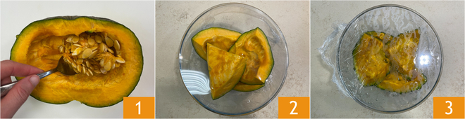 To prepare the pumpkin tiramisu, first cut a pumpkin in half and remove the seeds and inner fibers 1. Cut it into 4 pieces, place them in a bowl, and cover with plastic wrap 2. Cook in the microwave at 800 W for 10-15 minutes until the flesh becomes soft 3.