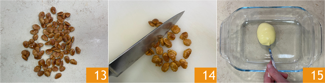 At this point, pour the almonds onto a marble surface 13 or a baking tray and let them cool. Once cooled, chop them with a knife 14. Everything is ready to assemble the tiramisu. In a dish, create a light layer of cream 15.