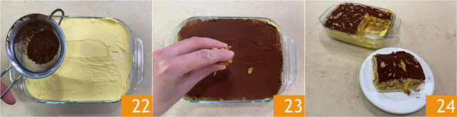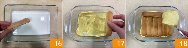 Soak the ladyfingers in milk 16, or coffee if you prefer, and create a layer of ladyfingers 17. Cover with more cream 18.