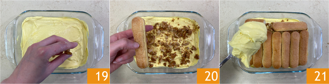 Now add half of the chopped caramelized almonds 19, continue with another layer of soaked ladyfingers 20 and another layer of cream 21.