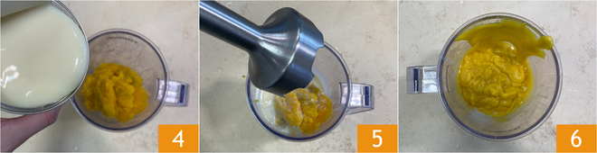 Scoop out the flesh and place it in a jug, add the condensed milk 4, then blend with an immersion blender 5 until smooth and homogeneous 6. Cover with plastic wrap and let it cool in the refrigerator.