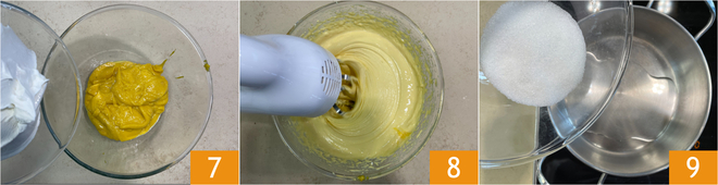 Once cool, transfer it to a bowl, add the mascarpone 7, and beat with an electric mixer 8 to obtain a fluffy mixture. Rest it in the fridge until ready to use. Now focus on the caramelized almonds. In a pot, pour the water and add the sugar 9. Melt the sugar over medium heat.