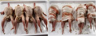Take the quails and remove any small remaining feathers, then sprinkle the outside and inside with roast herbs and place a slice of bacon and a sage leaf inside each one.