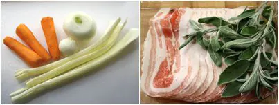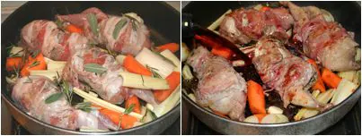 Wrap a couple of slices of bacon around each quail and tie them with kitchen string, then place them in a pan containing hot oil, the halved garlic, and the vegetables cleaned and cut into large pieces.