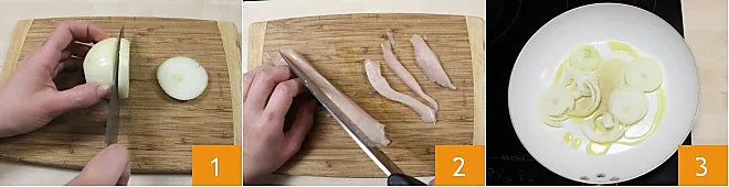 To prepare the quesadillas, start by slicing the onion into not too thin slices 1. Then, handle the chicken breasts: place them on a cutting board and cut them into strips 2. After heating a bit of oil in a non-stick pan, add the sliced onion and cook over low heat until golden 3.