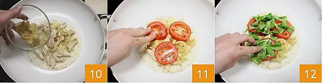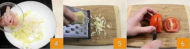 Then, add the chicken strips 4 and cook for about 15 minutes, seasoning with salt to taste. Meanwhile, grate the fontina cheese (or Edamer) 5, carefully wash the tomato, and slice it 6.