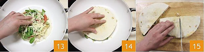 Finish with another layer of grated cheese 13 and close with another tortilla, pressing well to adhere the cheese to the tortilla 14. Once the heat is off, transfer the quesadillas to a cutting board and divide them into 4 parts 15. Your quesadillas are ready to be served and enjoyed while still hot!