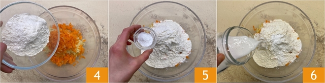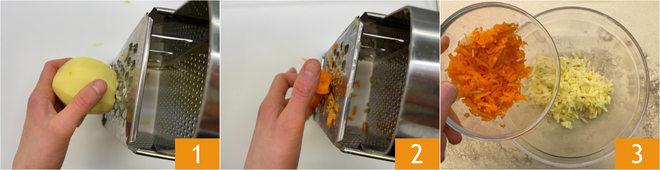 To prepare the quick dinner savory pie, first peel and finely grate the potatoes 1 and carrots 2. Collect the grated vegetables in a large bowl 3.