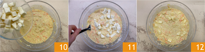 Once you've obtained a homogeneous dough, add the diced provolone 10 and mix again 11 to incorporate it evenly 12. Pour the obtained mixture into a 12.5x10 inch baking pan lined with parchment paper.