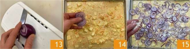 Now finely slice the red onion using a mandoline 13. Distribute the onion over the surface of the dough 14, then sprinkle with the grated Parmigiano Reggiano 15.