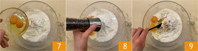 Also add the eggs 7, salt, and pepper 8. Mix well to combine everything 9.