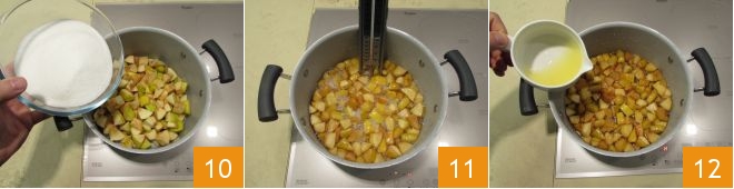 Add the sugar 10 and cook over medium heat until the fruit has softened. Continue stirring to promote even cooking. When the mixture nearly reaches a temperature of 226°F (about 30 minutes) 11, measured with a kitchen thermometer, add the lemon juice 12.