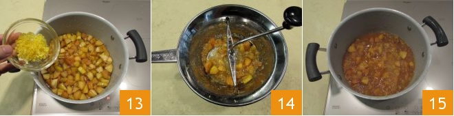 Also pour in the grated lemon peels 13 and mix well to flavor your jam. Then turn off the heat and remove about 3/4 of the jam from the pot: pass it through a food mill 14 to make it creamier and smoother. Add it back into the pot with the whole quince pieces 15.