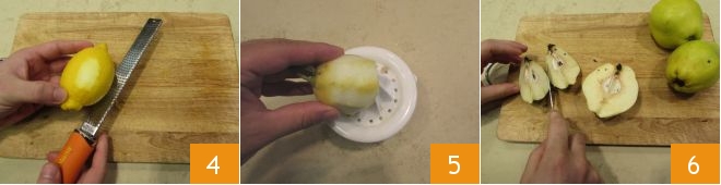 Then focus on preparing the jam. Take the untreated lemons and grate their peel 4, which you will set aside. Then squeeze the lemons to obtain the juice 5. Wash and dry the quinces thoroughly. Remove the stem and then cut them into quarters 6. It is not necessary to peel them.