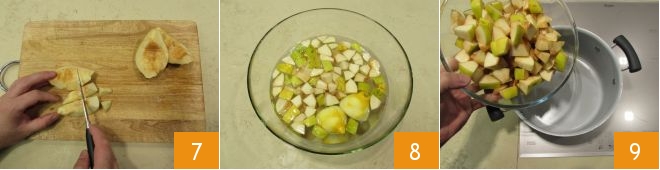Remove the core and cut into cubes of roughly equal size to ensure even cooking 7, placing them as you cut into a bowl with acidulated water (you can also use the squeezed lemons) to prevent browning 8. Once you have finished preparing the quinces, drain them using a skimmer to drain the excess water and place them in a deep pot 9.