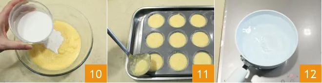 Take the mixture and lastly add the coconut milk 10, mix to combine the ingredients and pour the mixture into the mold using a ladle 11. Heat water in a saucepan 12