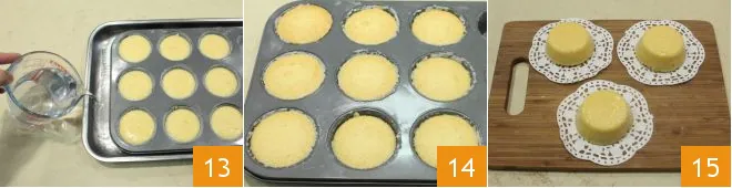 and pour it into the large tray 13 containing the mold, the water should cover two-thirds of the molds. Bake in a preheated static oven at 350°F for 40 minutes (or 320°F fan oven for 30 minutes). Once cooked, take your quindim out of the oven 14 and let them cool before unmolding, turning the mold over onto a tray. The Brazilian quindim are ready to be enjoyed 15.