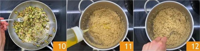 When the zucchini are well browned, remove the garlic 10 and let them cool slightly. Meanwhile, the quinoa will be cooked, so check that all the water has been absorbed, then season with a drizzle of oil 11 and fluff with a fork 12.