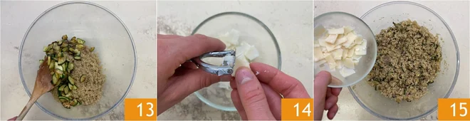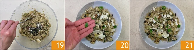 Transfer the quinoa to a large bowl and add the zucchini 13, then mix. Now shave the piece of Grana Padano with a potato peeler 14 and add it to the bowl 15.