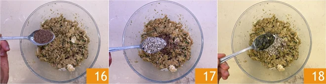 Finally, add the flax seeds 16, sunflower seeds 17, and pumpkin seeds 18.