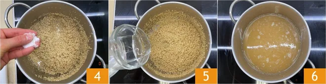 Add salt 4, add the water 5, and let it simmer for about 20 minutes 6; it should absorb all the liquid.