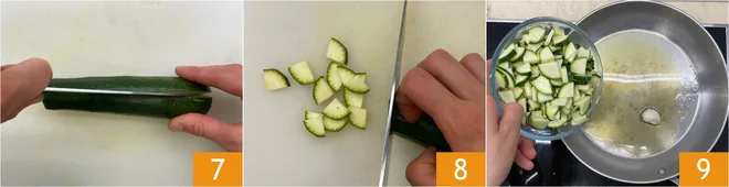 Meanwhile, take care of the zucchini: trim them and cut them lengthwise 7 into 4 parts, then slice them into thin triangles 8. In a pan, flavor the oil with a clove of garlic, then add the zucchini 9 and sauté over medium heat for about 10 minutes.