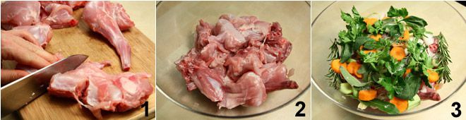 Remove the head, fat, and internal organs from the rabbit, then cut it into pieces 1, wash it and pat it dry with kitchen paper. Place the rabbit pieces in a large bowl 2 and add a peeled and coarsely chopped onion, a peeled and sliced carrot, the chopped celery stalk, peeled and crushed garlic, rosemary, thyme, cloves, cinnamon, peppercorns, sage leaves, basil, bay leaf, and parsley 3.
