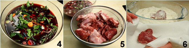 Cover everything with red wine 4, add a couple of pinches of salt, and seal the bowl with plastic wrap (or cover it with a lid) and let it marinate in the refrigerator for a minimum of 12 to a maximum of 34 hours. After the marination time, drain the rabbit 5, pat it dry with kitchen paper, and flour the pieces 6.