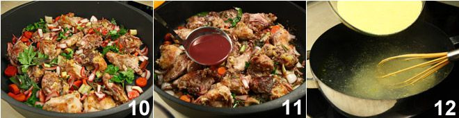 In the meantime, drain the vegetables and spices and add them to the rabbit 10; let them brown for 5 minutes over low heat, turning occasionally. At this point, add the remaining marinade 11 (now just the liquid), which should more or less cover the rabbit, put a lid on the pot and let it cook over low heat for at least 50-60 minutes. Meanwhile, prepare the polenta by putting a couple of liters of water on the stove: as soon as it comes to a boil, add the salt and a tablespoon of extra virgin olive oil, then remove the pot from the heat, add the cornmeal in a stream and mix with a whisk 12.