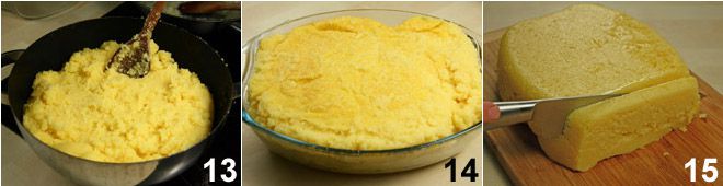 Put the pot back on the stove (low heat) and stir with a wooden spoon until the polenta is cooked 13, then pour it into a container 14 (preferably rectangular) that you have previously brushed with oil. Let the polenta cool well and then turn it out onto a surface and cut it into slices about 0.39 inches thick 15 which, if desired, you can also grill on a griddle.