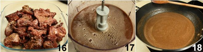 Returning to our rabbit: after the cooking time, remove the lid from the pot and adjust the salt and pepper. Remove the pot from the heat, drain the rabbit pieces, and place them in a container that you will keep warm 16. Blend the cooking base 17 (liquid and vegetables) to obtain a cream that you will reduce until reaching the desired thickness 18;