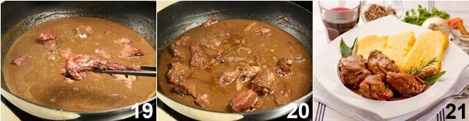 add the rabbit pieces 19, let them cook together for 5 minutes 20, and then turn off the heat. Serve the rabbit in salmì immediately with the slices of polenta 21 drizzling them with the obtained cooking base.