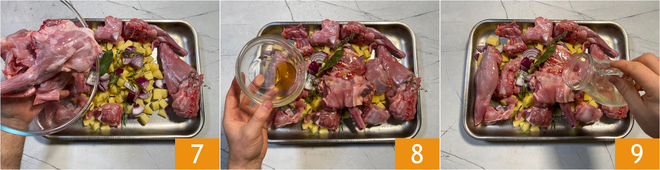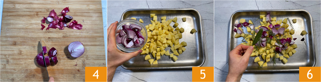 To prepare the oven roasted rabbit, start with the potatoes. Peel them 1 and cut them into irregular chunks about 1/2–3/4 inch 2. Put them in a large baking tray 3.