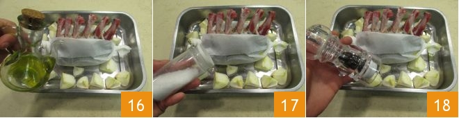 Season with a drizzle of oil 16, salt 17, and pepper 18.