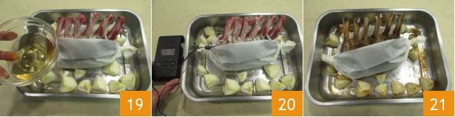 Then pour the light beer into the baking dish 19 and insert the probe that will be used to monitor the temperature of the meat 20. Cook in a preheated oven at 356°F for 36 minutes, until the center of the meat reaches a temperature of 140°F. Then remove the lamb from the oven 21,