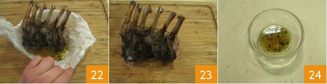 open the parcel 22 and remove the ribs 23, keeping the cooking juices aside 34.